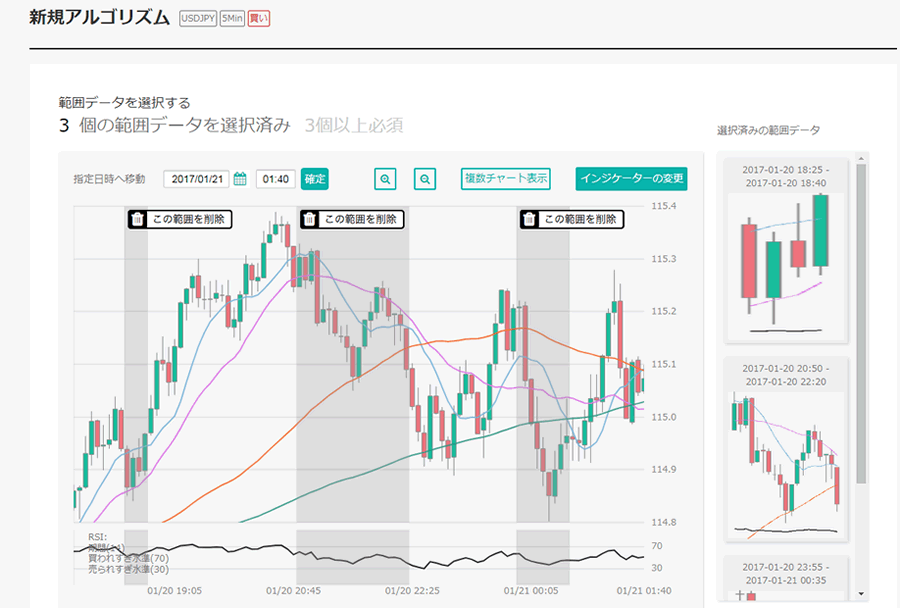チャートからエントリータイミングを3つ以上選択するだけ!AIが選択されたチャートパターンを学習し、投資アルゴリズムを作成します。作成したアルゴリズムは、バックテストの結果を見ながら編集することもできます。