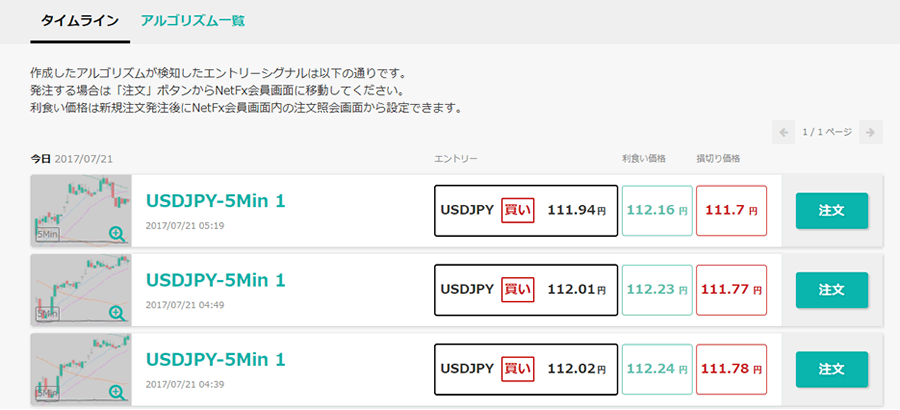 アルゴリズムに基づいた取引のタイミングを、パソコン画面上、もしくはご登録のメールアドレスへリアルタイムに通知します。また、「タイムライン」画面の「注文」ボタンからすぐにNetFx会員画面の注文入力画面へ遷移できるため、取引チャンスを逃しません。